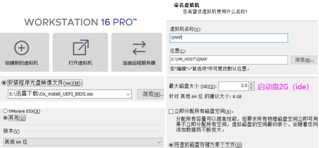 创建新虚拟机(自定义)/硬件兼容性(默认)/选择IOS镜像(Ox_install_UEFI_BIOS.iso)/其它(其它64位)/虚拟机名称和位置/内存、CPU(看着分配)/网络连接(使用桥接网络)/IO控制器(默认)/磁盘类型(IDE)2G