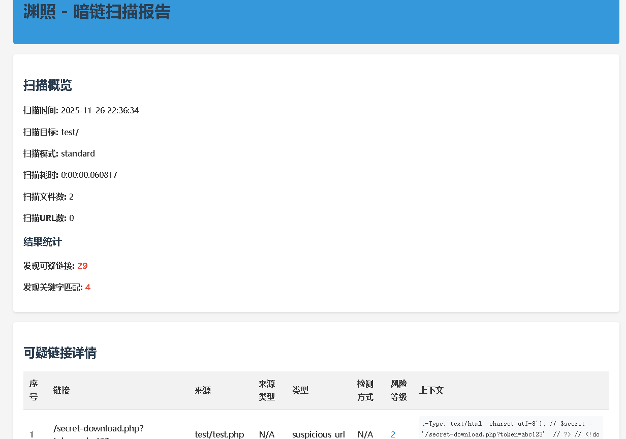 target: 扫描目标(文件路径、目录路径或URL)- 必需参数-d, --depth: 递归扫描深度(默认:3,0表示仅扫描当前文件/目录)-m, --mode: 扫描模式(fast/standard/deep,默认:deep)-t, --threads: 并发线程数(默认:8)