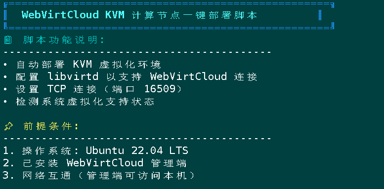 本文档提供在 Ubuntu 22.04 系统上部署 KVM 虚拟化计算节点 的完整操作流程,专为配合 WebVirtCloud 管理平台使用而设计。通过配置 libvirtd 服务以监听 TCP 端口(16509),并结合严格的防火墙规则,实现 WebVirtCloud 管理端对远程 KVM 主机的安全、无密码连接与虚拟机集中管控。适用于构建轻量级、分布式的 KVM 虚拟化基础设施。