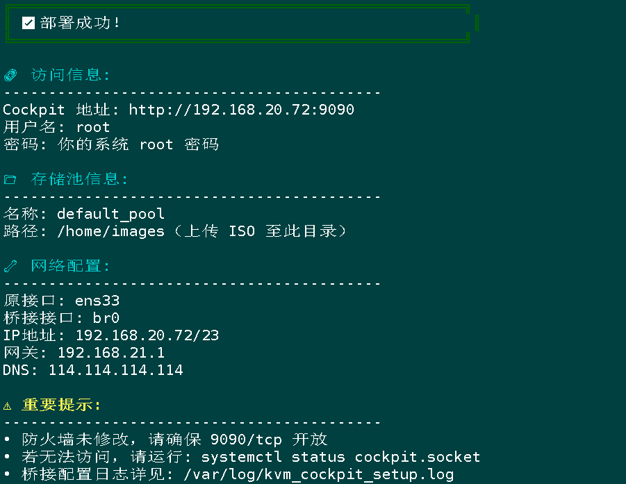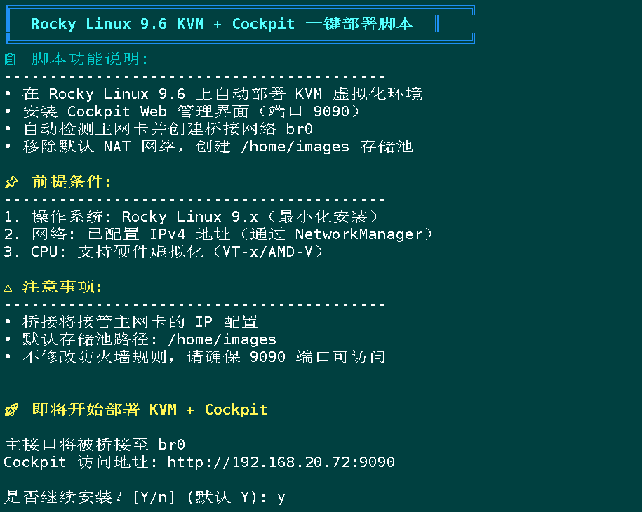 本指南适用于 物理服务器 或 虚拟化平台内嵌套运行 KVM 的场景,尤其注重解决桥接网络、存储池创建、Cockpit 界面与 CLI 协同配置等常见难点。