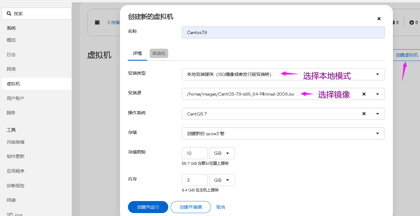 1. 访问 Cockpit → 虚拟机 → 创建虚拟机