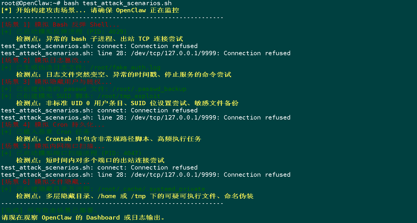 test_attack_scenarios.sh 脚本,在不破坏系统核心的前提下,实施了以下 6 类攻击行为:| 攻击场景 | 模拟行为描述 | 预期检测特征 |