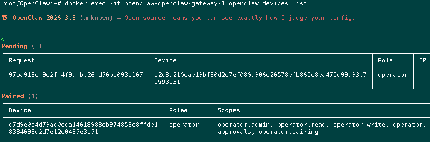 docker exec -it openclaw-openclaw-gateway-1 openclaw devices list
