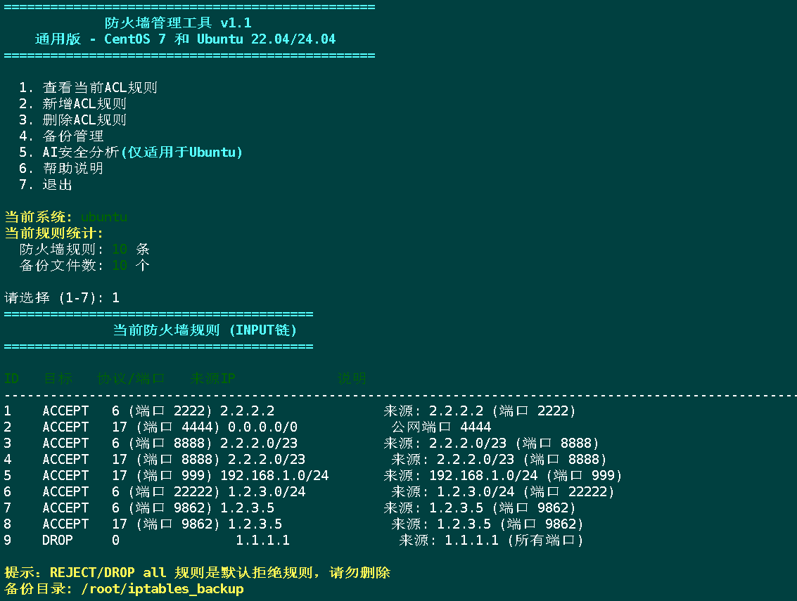 选择 1 查看当前所有防火墙规则,自动显示规则说明和安全检查结果。