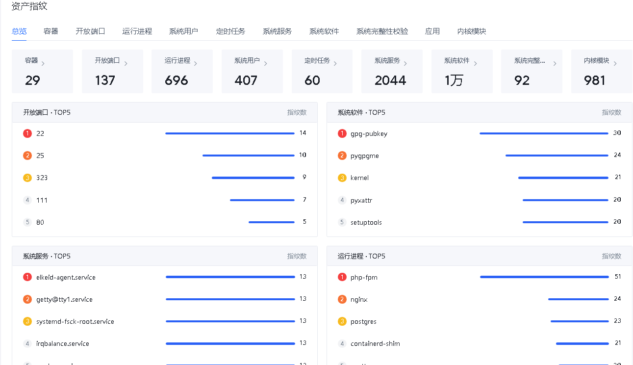 资产指纹:收集进程、端口、账号、软件包等详细信息。