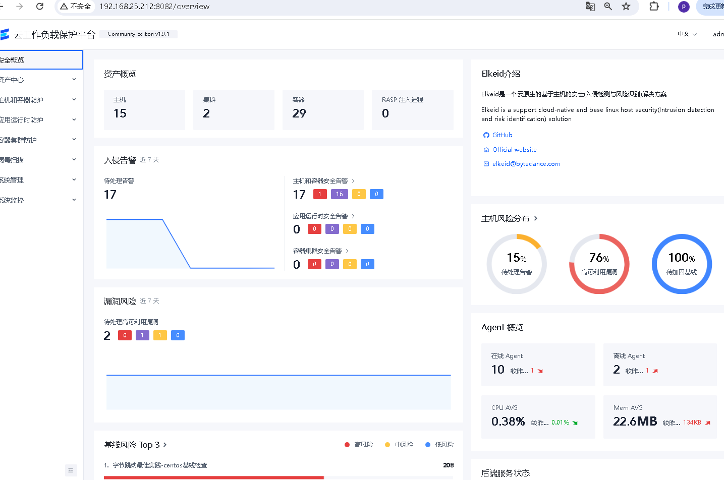 Elkeid 是字节跳动开源的一款主机型入侵检测系统,采用 C/S 架构,支持主机、容器、Serverless 等多种工作负载。社区版提供基础功能,商业版功能更全。本次测试基于社区版 v1.9.1。