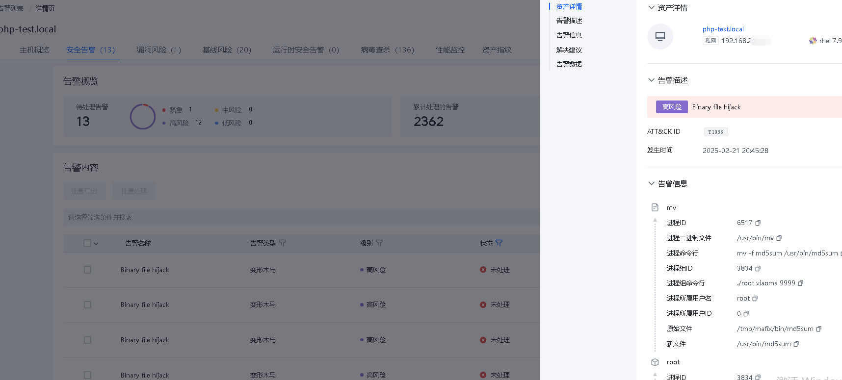 测试结果:✅ 成功触发告警,说明 Elkeid 对已知恶意软件特征有较好的识别能力。