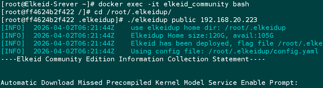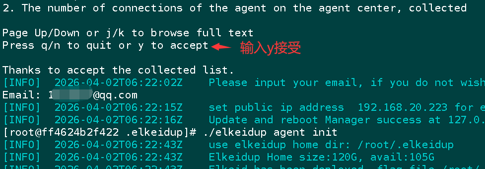 ./elkeidup public时,需阅读并接受信息收集声明(输入 y),并按提示输入邮箱(可选),部分安装过程截图: