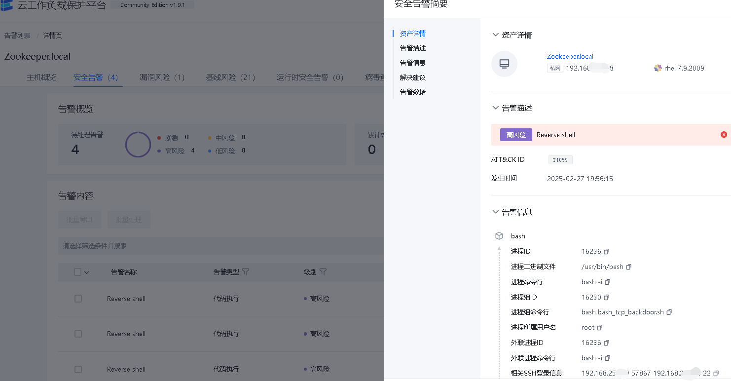 测试结果:✅ 成功触发告警,Elkeid 能准确识别此类明显的恶意网络行为。