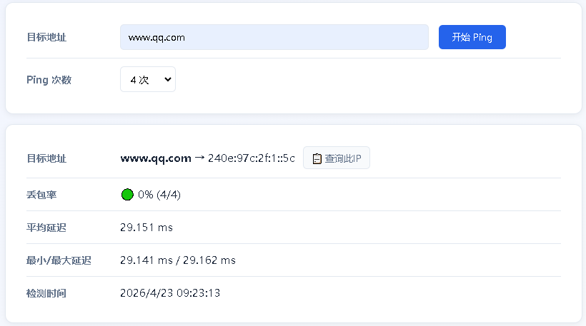 - IPv6 Ping 检测:通过 ICMPv6 协议测试目标地址的连通性、延迟和丢包率