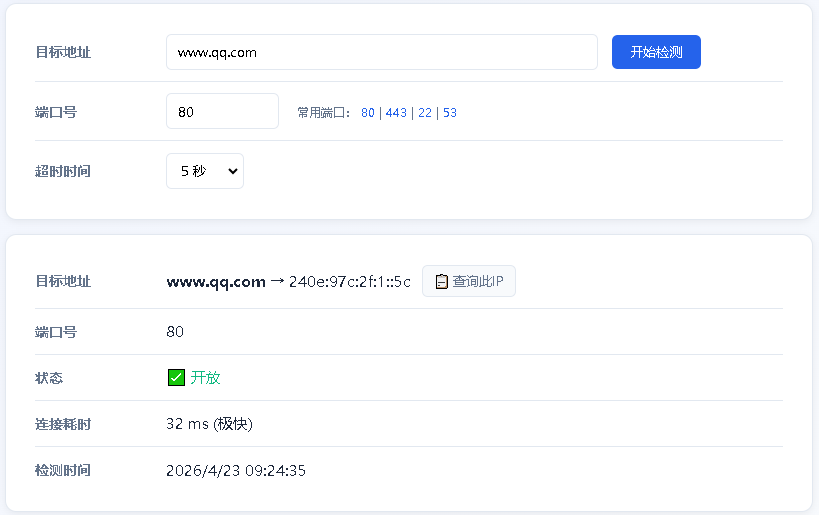 - TCP 端口检测:测试 IPv6 地址的指定端口是否开放